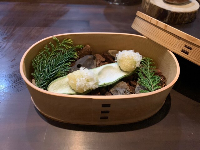 鯵を秋田杉で燻製にし、胡瓜と一緒に春巻きにしてます。白神にんにくのサワークリームをあわせて。