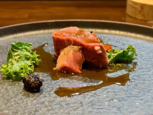 錦牛をローストビーフにし中心だけを使い、低温調理した岩牡蠣とタルタルにしてます。