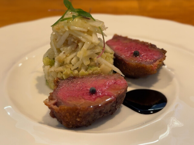 ソースはセリの新芽、山椒を使ったマルサラソース。