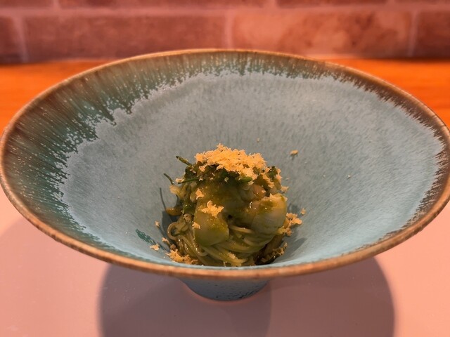 冷製カッペリーニはジェノベーゼでニシ貝、おかひじき、ヒラメの卵から作った唐墨を和えて。