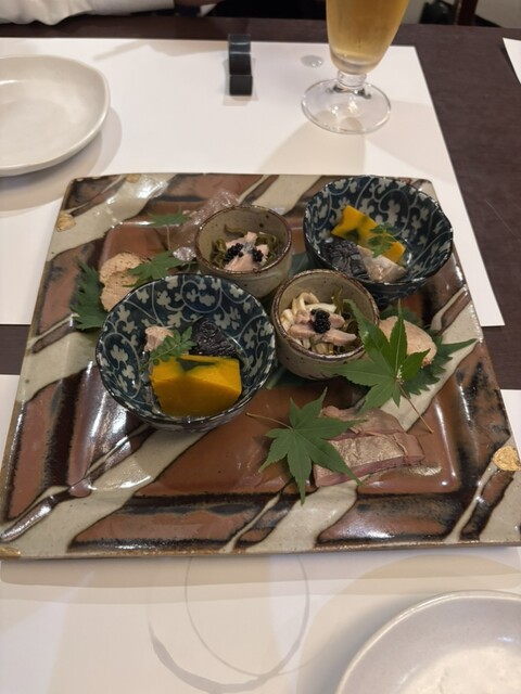 かぼちゃとナスと鴨の手羽元のたいたんほか前菜3品。