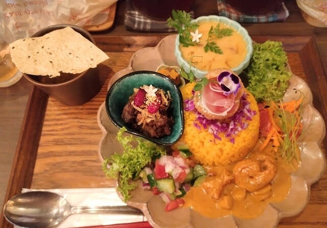 一口食べた瞬間、スパイスの香りがふわっと広がり、口の中で海の旨味と絶妙に溶け合いました。「気まぐれプレート」は見た目がとても華やかで、細やかな装飾に驚きます。梅干しの上にも飾りがあり、ピンクグレープフルーツやマスカットといった意外な食材が隠されていて、まるで宝探しをしているよう!味のバランスもよく、スパイシーさの中にフルーツの爽やかさがアクセントとして効いていました。ご飯との相性も抜群で、最後まで飽きずに楽しめました。量も適量で、満足感があります。