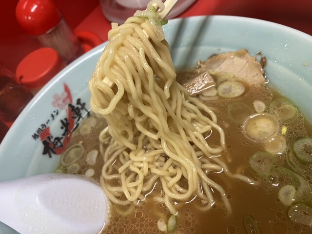 故郷の旭川に帰省中です。ランチは梅光軒さんに訪問です。本店訪問は久々です。入店してカウンターに案内されました。すぐにオーダー確認です。当然、訪問前から醤油ラーメンに決めています。こちらのお店は醤油ラーメンが1番オススメです。それから少し待っているとラーメン到着です。先ず、スープを一口頂きます。かなり濃厚な魚介豚骨系の味が口いっぱいに広がります。やっぱりスープが美味いなぁ〜と実感です。次は麺を頂きます。少し縮れた麺にスープの旨味が絡んでいます。ツルツルと頂ける麺です。この麺も好きです。焼豚はデカいのが2枚入っています。柔らかく、少し脂がある焼豚は美味いです。焼豚2枚は嬉しいです。支那竹は脇役に思えますが、しっかりしたサイズと味わいがあります。決して脇役ではありませんね。この完成された一杯のラーメンに高評価を付けます。しみる一杯のラーメンです。スタッフさんの接客は大変よし。お値段は、1,030円でした。ラーメンが1,000円を超えるようになりました。ちょっと残念だけど仕方ないです。また、故郷のラーメンを満喫したいと思います。ありがとう!