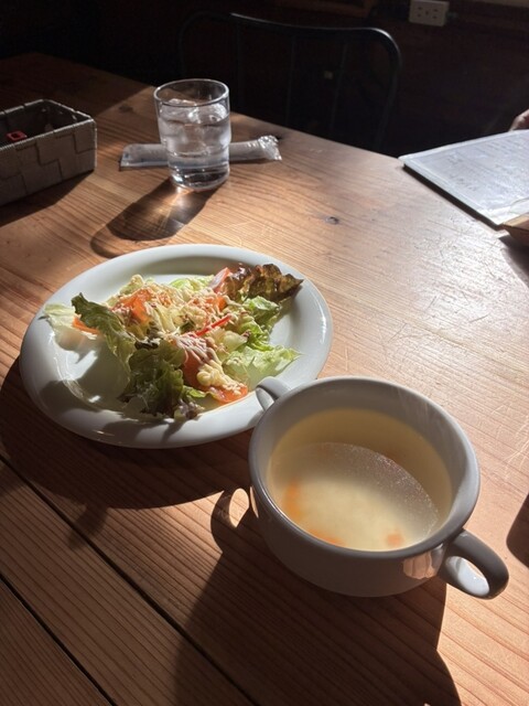 ドライブした時にログハウスの素敵なお店を見つけて寄りました。ジャズが流れていて、壁には電飾のツリーと薪ストーブがあり雰囲気もよくコタツ付きのテーブルに案内して頂きました。店員の方はトナカイやサンタの帽子で可愛らしかったです。名物的な鍋カルボナーラのコースで頼みました。マスのカルパッチョ、スープ、鍋カルボナーラ、わらび餅入のパンナコッタ、コーヒーです。鍋カルボナーラは、盛り付けが笑顔になっていて食べるのは勿体なかったです♪最後まで熱々で美味しかったです。