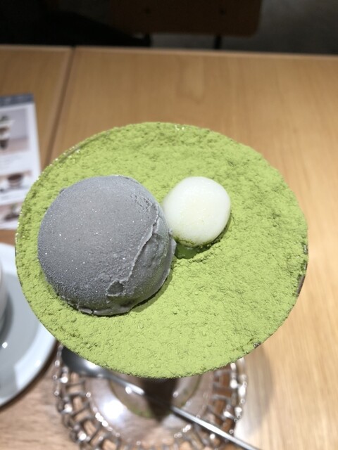 黒ゴマアイス、白玉1こ、上の抹茶パウダーは甘さ控えめ、下のマスカルポーネクリームは単体でも美味しいし、抹茶パウダーと一緒でもいい感じです。サイコロカットのパンケーキも入っていました。