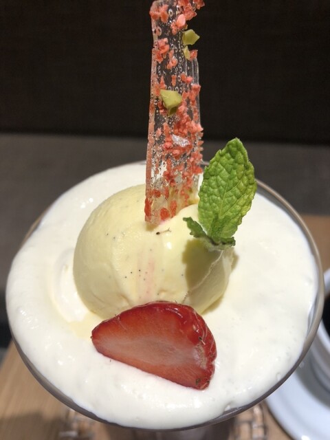 何にしようかな…メニューをみていると、これまで全く内容をみていなかったベリーのパフェ。苺とほぼ生クリームかと思ったら、白いのはティラミスクリーム!ブランマンジェも!