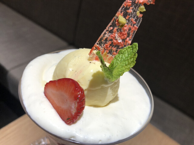 トップに苺とミント、透明な固い飴細工みたいなのがスッと刺さっている。見た目COOL ね。