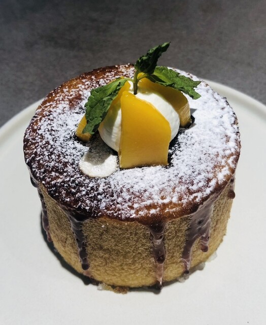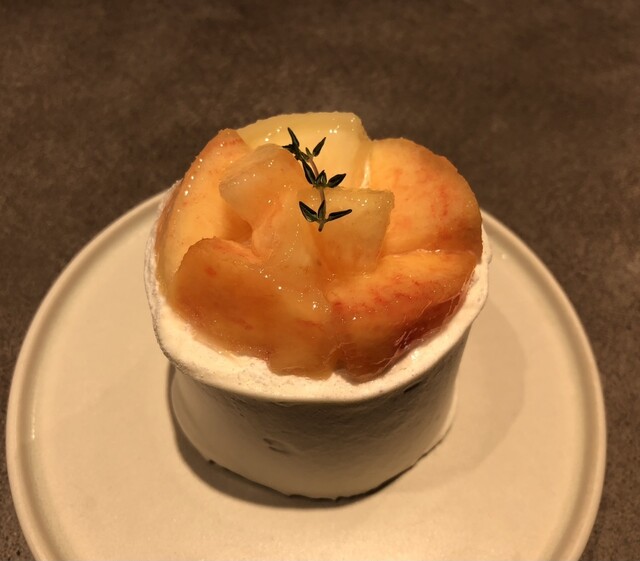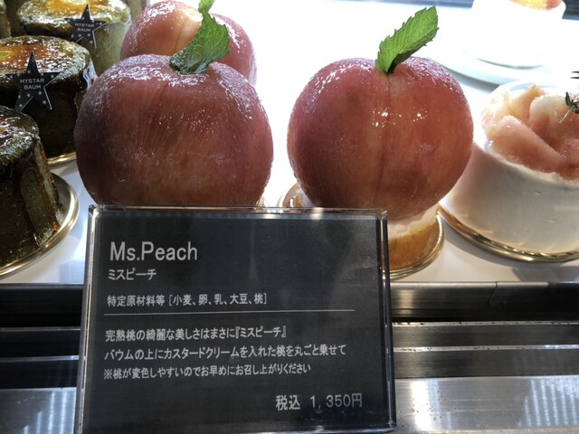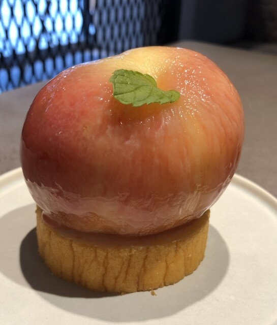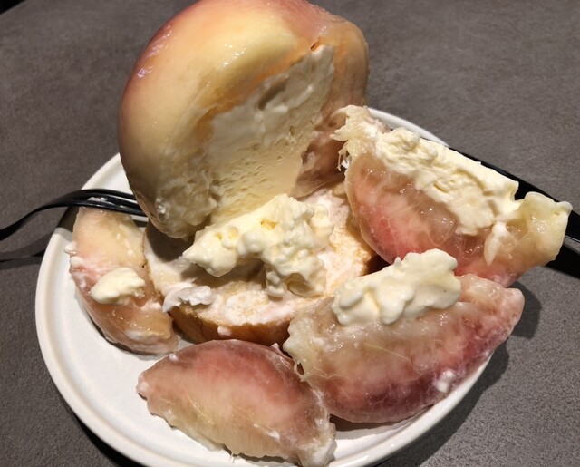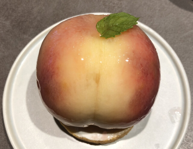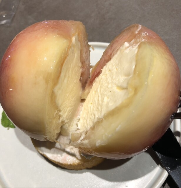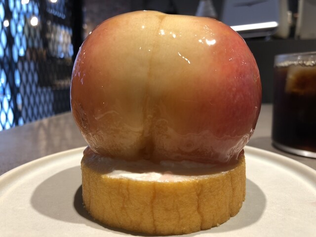 小ぶりなバウムクーヘンの上に、見るからに熟して甘そうな桃がまるごと1つのっています!