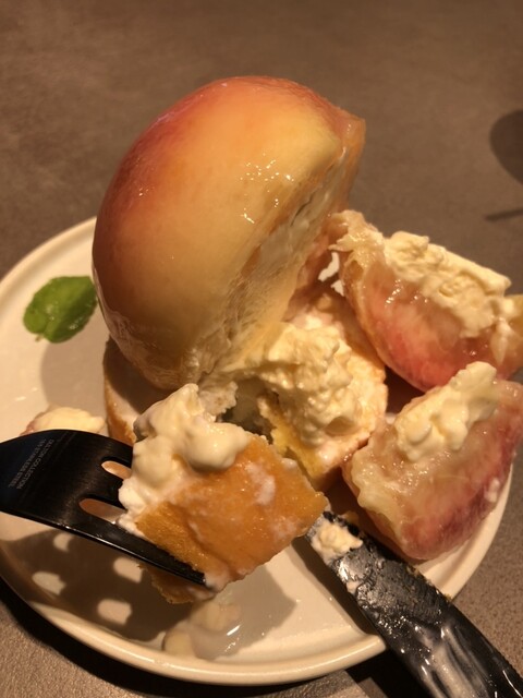 最後は、カット桃とカスタードクリーム、バウムクーヘン全部一緒に口へ。
