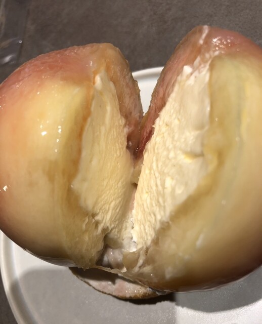 桃を真ん中でカットすると、カスタードクリームぎっしり