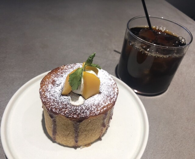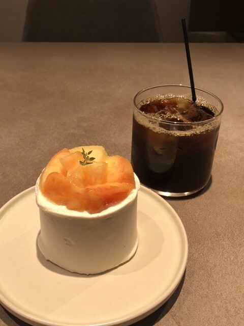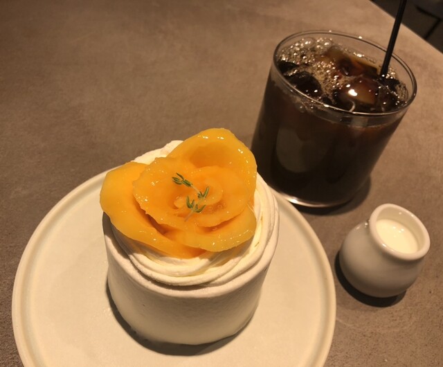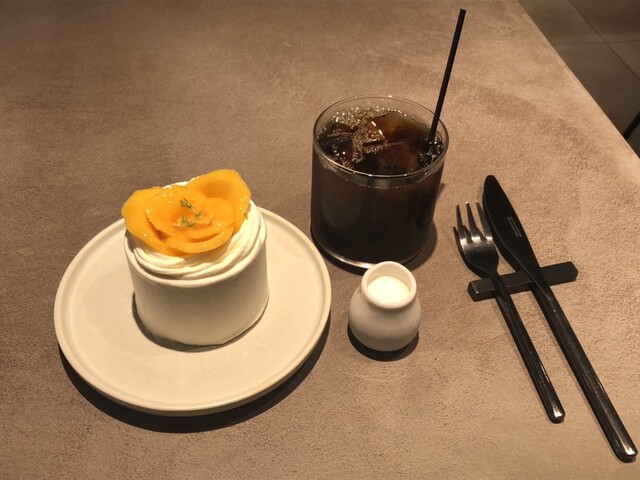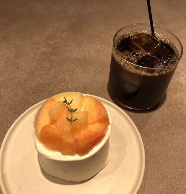 プレミアムピーチショートケーキと小杉ブレンドのアイスコーヒー