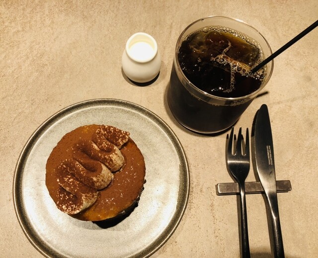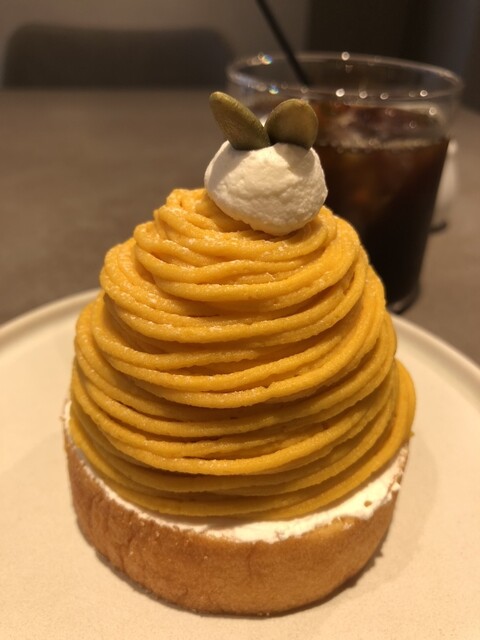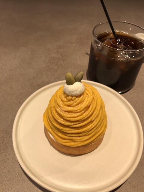 アイスコーヒーとパンプキンモンブラン同時に到着。