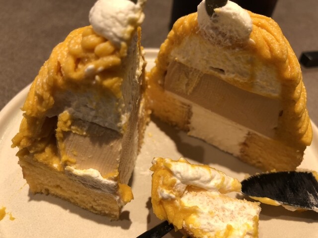 柔らかい甘いかぼちゃ味のパンプキンモンブランクリーム、ふあっと生クリーム、弾力があり、ほんのり優しいミルクプリン、しっとりですがしっかりお味が詰まっているバウムクーヘン。