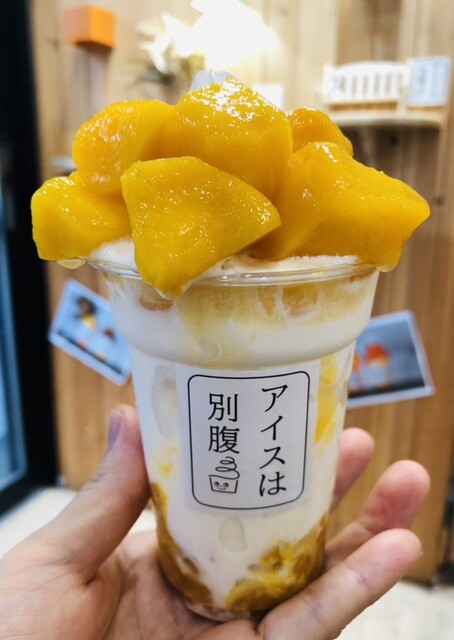 10センチほどのプラカップにソフトクリームっぷり、その上にソフトクリームが見えないくらいのキューブカットのマンゴーとホイップクリームがちょんとのっていました。