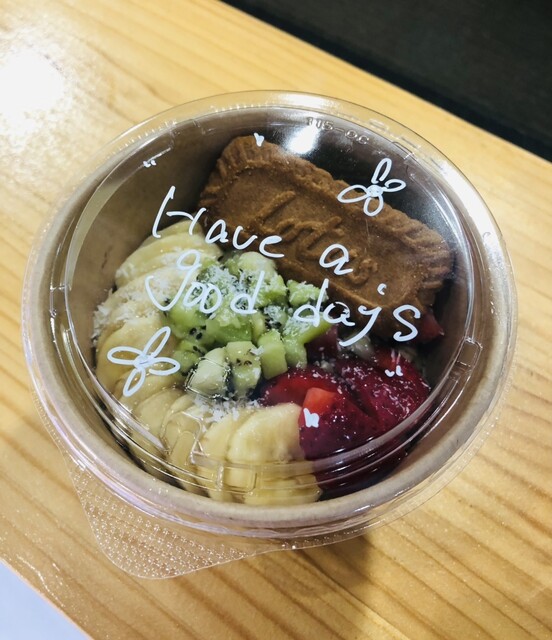 アサイーボウルの蓋やおしぼりの袋にも、スタッフさんからのメッセージ入りで、疲れた仕事帰り、なんだか嬉しいです。というか、こちらのカウンタースタッフお姉さん、どの方も愛想良きです。