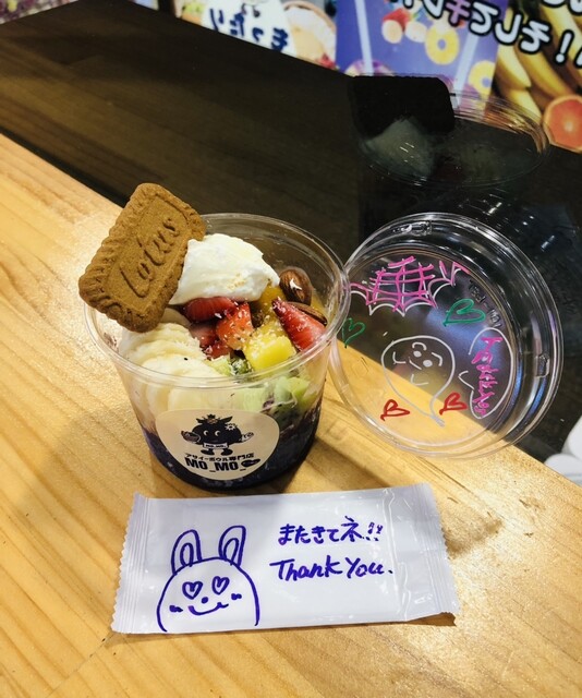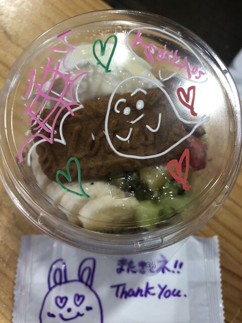紙おしぼりとアサイーボールの透明プラカップの蓋にはメッセージ入り^_^