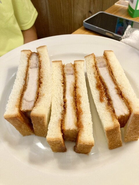 カツサンドとエビカツサンド…見た目が残念です。カットの幅も揃っておらず、ポテトとか何かもなくサンドイッチが3つお皿に乗っているだけ、寂しい気がしました。まぁまぁなお値段なのになぁ。味は美味しいです。