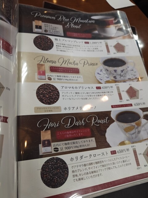 ㋔恥ずかしながらホリ珈琲さんというお店を存じ上げておりませんでしたが、メニューを拝見するとドリンクやデザートの種類が豊富で、モーニングメニューやランチのパスタも美味しそうでした。