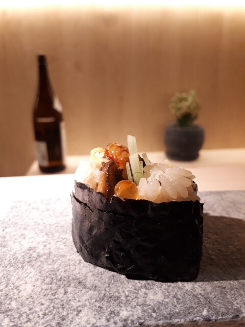 鮨竜太の2号店があるとのことでうかがいました。こちらは深夜まで営業しているバーようなお鮨屋さん。誰でも気軽に本格的なお鮨をいただけます。1カンからでももちろんオーケー。大将はケニアでお鮨を握った経験もあるそうで、面白いお話が聞けるのも魅力。場所がら外国からのお客様が多く、はじめてsushiを食べるお客様のリアクションを見られるのも楽しいです。竜太のDNAを受け継ぐ大将のハイクオリティーなお鮨をリーズナブルに楽しめるので、かなりの穴場ではないでしょうか?コスパ★★★★
