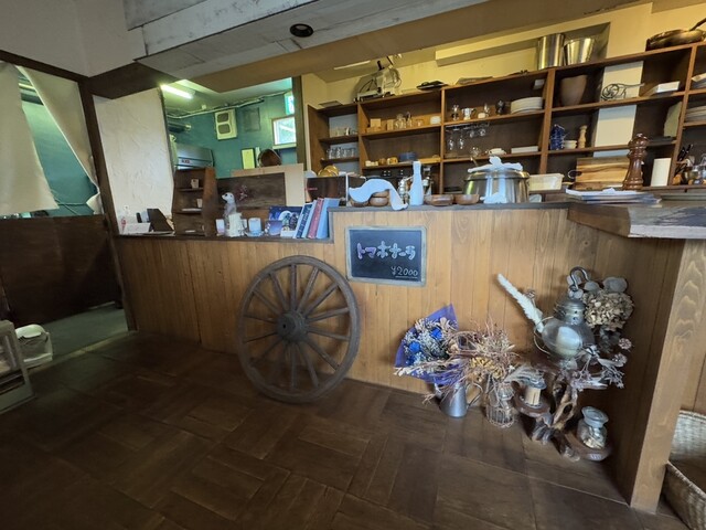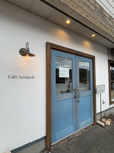 入り口近くで目に入るコテ塗りで仕上げた壁に浮かび上がる「Cafe Lomporo」も黒文字。その文字を優しく穏やかに暖色で照らすブラケットライト(ウォールライト)が素敵です。