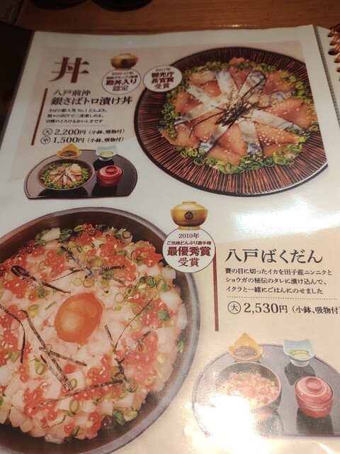 八戸に来たら是非これ、さばの串焼き690円を食べて欲しい!さばの概念が覆ります!パリっと焼けたかわに、肉厚ジューシーな身が絶品です。さば独特のくさみがほとんどないです。今まで食べてきた鯖は何であんなにしょっぱくて臭かったのか。何か美味しさの秘密があるのでしょう。銀さば漬け丼1500円(中)も、さば三種盛り(1900円)も美味しい。イカさし900円もボリュームあっていい。陸奥八仙いさりび1100円と良く合う!是非大事な人を連れて行きたいですね。