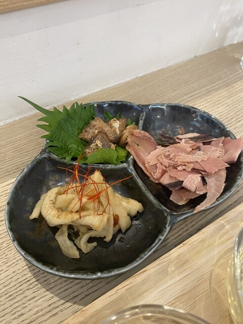 私は広島のお酒3種飲み比べ、牡蠣のスモークオイル漬け、おつまみ3種盛り(のどくろ、食べる鰹節、お酒で漬けた大根)を頼みました。