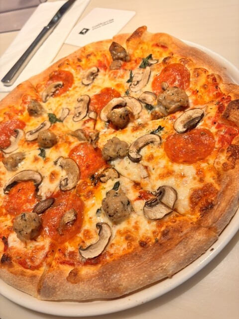 マッシュルームごろごろ、ペパロニぎっしり、ソーセージもしっかり、生地も厚めのボリューム満点ピザ。