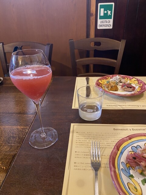 パスタだけだと確実に足りないので、メインの付け合わせのパンのほか、店名を冠した前菜盛り合わせ、イカのフリットを追加し、ソフトドリンクとしてブラッドオレンジジュースを追加しました。