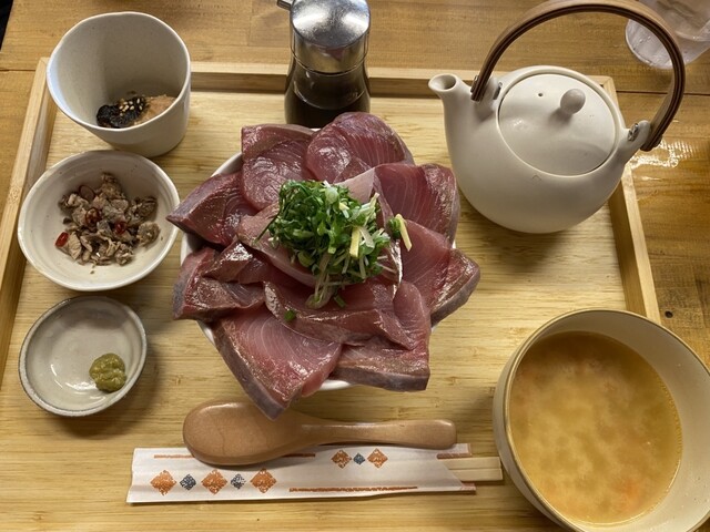 実は昼もこちらは営業しているようで、同様に混んでいました。昼はいくらを食べたので、こちらはちょっと違うものを食べようと思っていたところ、ちょうどぶりのお刺身の丼を発見。