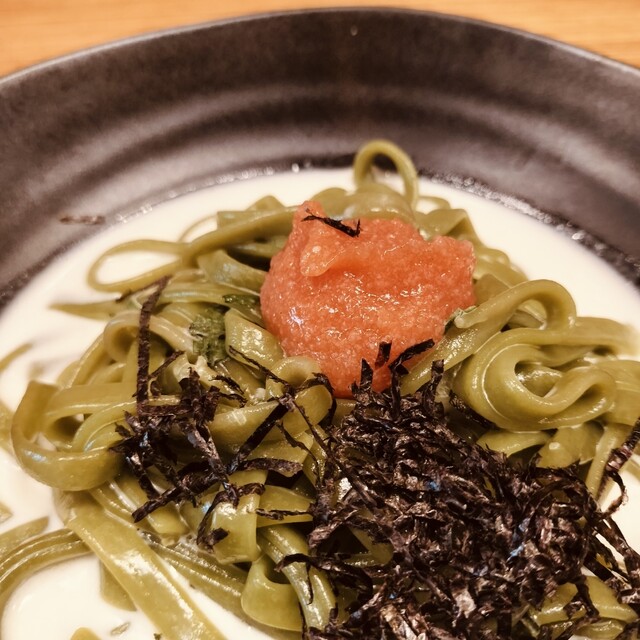パスタは明太子クリーム(ほうれん草めん)が個人的にイチオシ。ほかに3種類を...めん少なめにして全トライすべきだったと後悔。