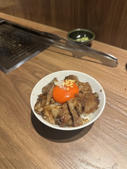 セットでライスと大分県さんの濃厚な卵黄が出てくるので、リブロースをライスの上に乗せて真ん中に卵黄のせてタレをかけたら、最高のお肉丼の完成!