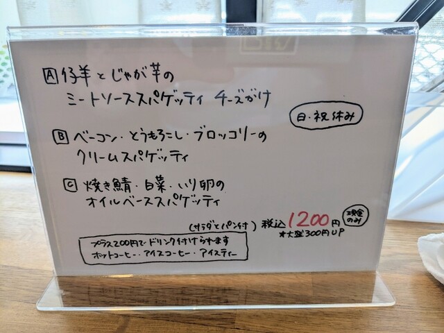 お目当てのメニューは、さんま 梅干 かいわれ 揚なすのオイルベーススパゲッティ 1200円。