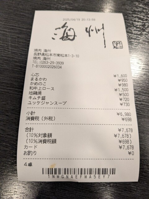 注文内容はレシートの通り、前回食べなかったまるかわとかめのこが脂身が少なく薄切りでさっと焼いて食べると美味しかったです。
