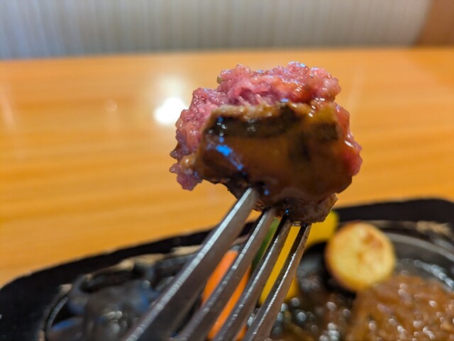 10分少々で、牛ちゃんの鉄板にのってげんこつハンバーグが登場。店員さんが半分に切り、切断面を鉄板に押し当て、ソースをかけてくれます。ハンバーグの外側は弾力があり、内側はレアでトロっとしていて食感が楽しめます。ソースはデミグラスとオニオンの2種類でどちらもハンバーグによく合ってなまらウマシ!