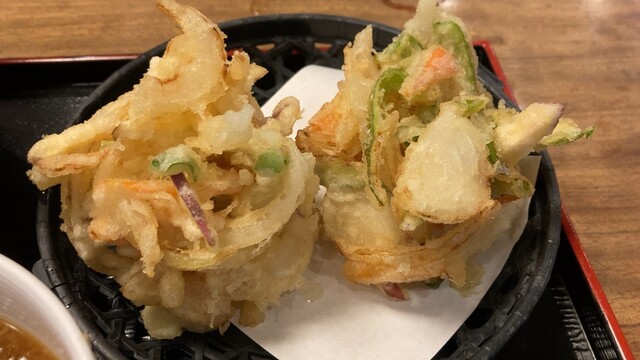 かなり大きめのかき揚げが2個とかなりのボリューム感!揚げたてサクサクで、野菜の甘みがしっかり感じられました。