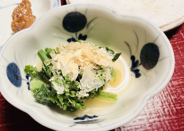 ツボミ菜おひたし、トッピングは鶏肉を削り節にした物