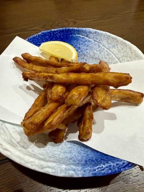 牛たんの網焼き、だし巻き玉子、ひまチキ(唐揚げ)、ごぼうの唐揚げ、ちくわのチーズ揚げ、山芋の鉄板焼き、鶏釜飯、鶏雑炊をいただきました