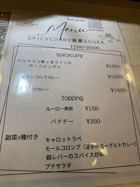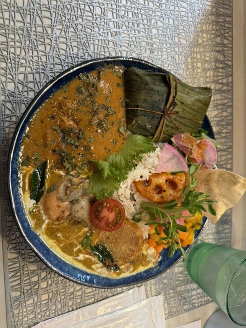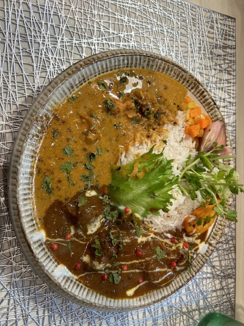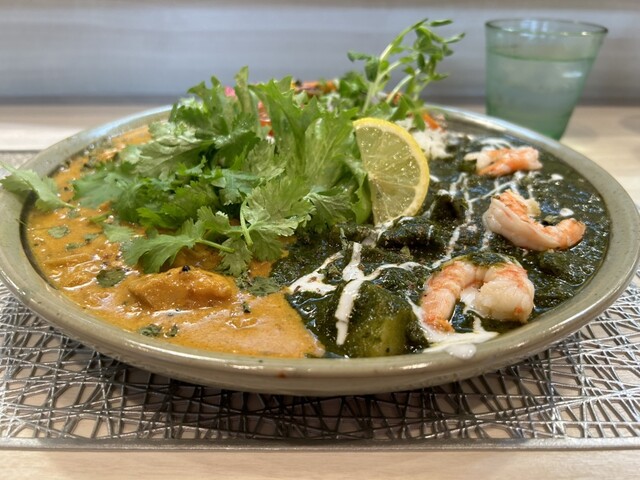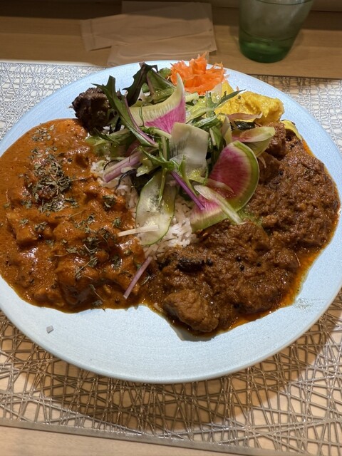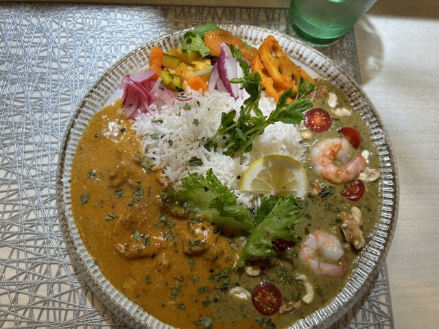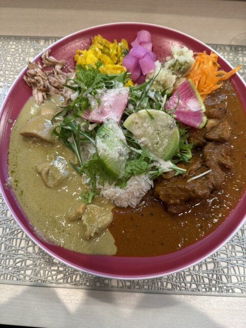 間借りしているSPICYCURRY颯薫(SOUKA)のスパイシーカレーを食べに行きました。今日は、「花山椒と実山椒のキーマとチキングリーンカレーのあいがけ」をいただきました。見た目がとても華やかで、味も多彩に楽しめる贅沢なカレーでした。
