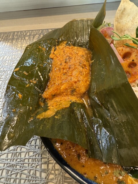 多くの食材で色どられ、気配りを感じる一品です。極め付けは、皿のてっぺんにあるいちご。白和えの上に載ったいちごには驚きましたが、その下にある白和えは、豆腐とチーズで作られたそうで、デザート感覚で味わえるものでした。豊富な野菜と、チキンをはじめとした多彩な肉、それにデザートがついた、まさに、フルコースのカレーでした。