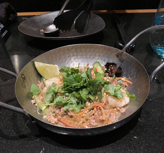 メインはタイの激辛炒め麺パッキーマオを選びました。こちらはライムを絞って一口。辛旨い。一般的なタイ料理の唐辛子由来の辛さに対してこれは生の胡椒による鮮烈な辛さですね。でも激辛という程ではなく美味しく頂ける辛さです。ライムとバジルの香りがいいですね。麺は中華の刀削麺のような幅広麺です。適度なもちもち感があって美味しいです。