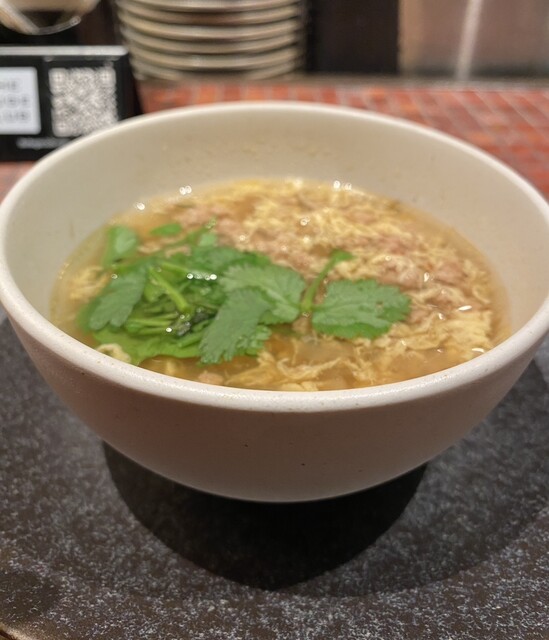 今回はメインが選べるランチコース(税別1980円)を注文。最初に提供された香り高いジンジャーグラスティーを飲みながら待つことしばし。本日のスープはこちら。ベトナム風のレモングラスチリスープです。まず一口。旨い。レモングラスとパクチーの香りがいいですね。具材には鶏挽肉とたっぷりの春雨が入っています。チリスープなのでちょっとピリ辛です。