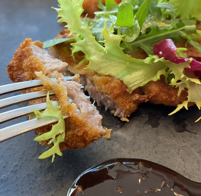 そしてメインはパルメザン風味の豚ロースのカツレツです。これも一口。旨い。かりっと揚がった熱々のカツレツにバルサミコ酢ベースのソースを少しずつ加えながら頂きます。ほのかに香るのはパルメザンでしょうか。これも実に美味しい一皿でした。