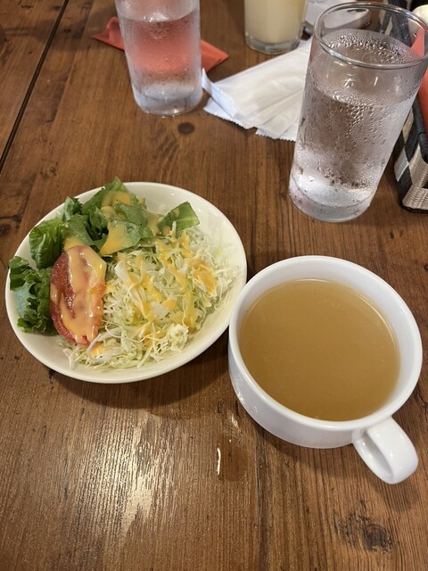 サーモングリルのランチをいただきました。鉄板は熱いです。付け合わせはマッシュポテト、にんじん、ブロッコリです。カットレモンとタルタルソースも乗ってます。サーモンにタルタルをつけて食べると美味しかった。スープはしょっぱい。