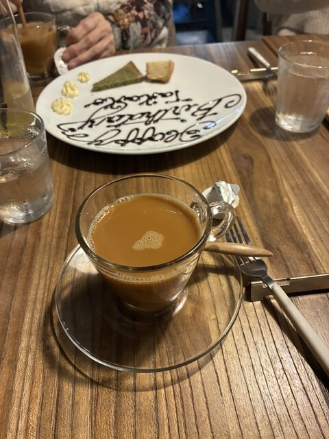 今日は母の誕生日祝いで、旦那と妹とお母さんと私の4人で、ランチに行きました。2000円のコースと3000円のコースと5000円のコースが、あってデザートも食後の飲み物も付いた、3000円の方のコースを頼みました。妹は赤魚のポワレにして、残りの3人は牛肉のニンニクソースの方にしました。スムージーのついた前菜とサラダのついたプレートとフォッカッチャと牛肉のニンニクソースとパフェとフィナンシェの焼き菓子と食後の飲み物はコーヒーを頼みました。無料で、母の誕生日プレートも付けてもらえて自分では作れない料理の数々で、とても満足でした、