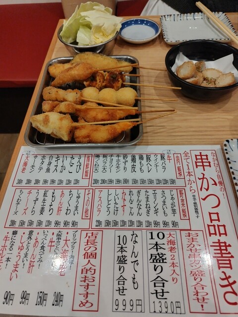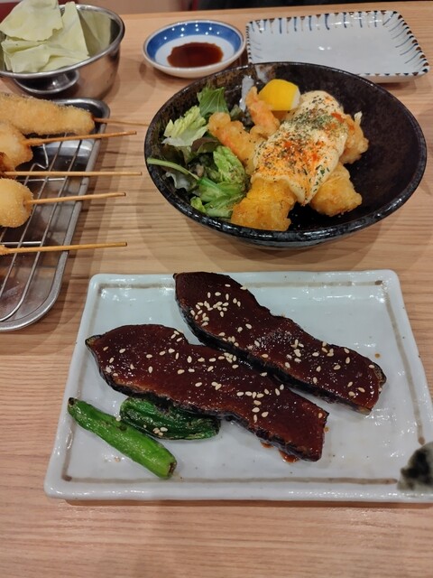 串かつ大海老2本入り10本盛り合せ(1529円)、里芋唐揚げ(363円)、なす田楽(308円)、反則のエビマヨ(759円)をいただきました。