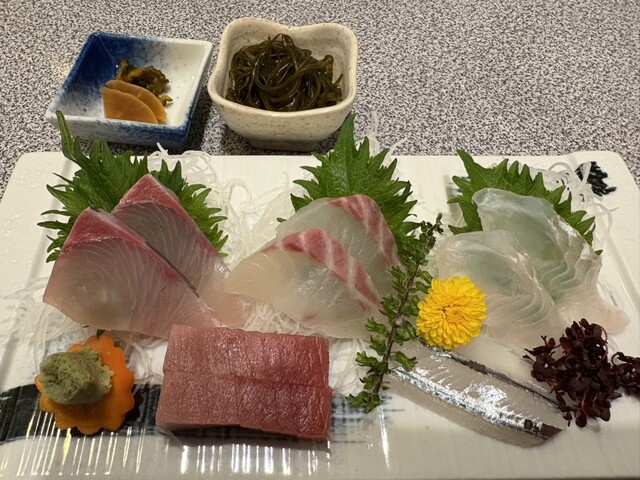 マグロ中トロ、ブリ、鯛、ヒラメ、サヨリの5点盛り。昆布煮の小鉢と漬け物、しじみの味噌汁がセットで2,200円でした。