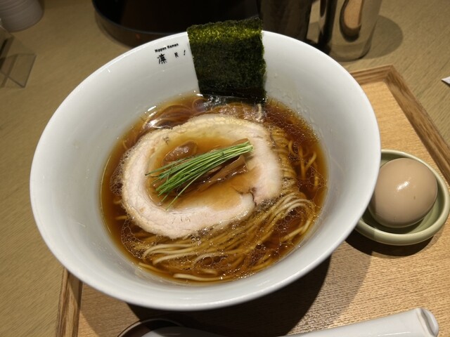 東北新幹線で10時56分東京駅到着、一目散に当店を目指しましたが、見当たりません。確か、『八重洲中央口』近くのはず…。はたと、『八重洲地下中央口』と気付き、急いで店頭まで。11時5分、早い時間帯のせいか、行列は一切なし。券売機で悠々と、『醤油らぁ麺味玉子付(税込1530円)』の食券を購入。『お好きな席にどうぞ。』というので、お好きな席に!時間帯のせいか比較的空いていて、カウンター席に7人くらいのお客さんがいましたが、ほぼ1人置きくらいに座っていました。先に、別皿の味玉子がきて、ほどなくらぁ麺が着丼。醤油の香りが心地よい!まずは、スープから。透き通った見た目と違い、意外に濃いと思わず思いました(笑)。実は、濃いのではなく、『3種の地鶏と豚、5種の本醸造生揚げ醤油を絶妙にブレンドしている。』とのこと。コク(こく)があって、濃く(こく)感じました(笑)。美味し!美味し!細麺も『小麦の香りと食感、たおやかさが感じられる。』とのことで、コクのあるスープを拾って、美味っ!美味っ!でした。麺の上にあった不思議なものは、聞けば、『芽ねぎ』。珍しいトッピング?黄身トロットロの味玉子、大ぶりチャーシューもとろりんこ!本当にコクあり、濃くあり、完飲するのが名残惜しい一麺でした。ご馳走様でした。私が店を出る頃には結構混み合って来て、インバウンドのお客さんも来ていました。
