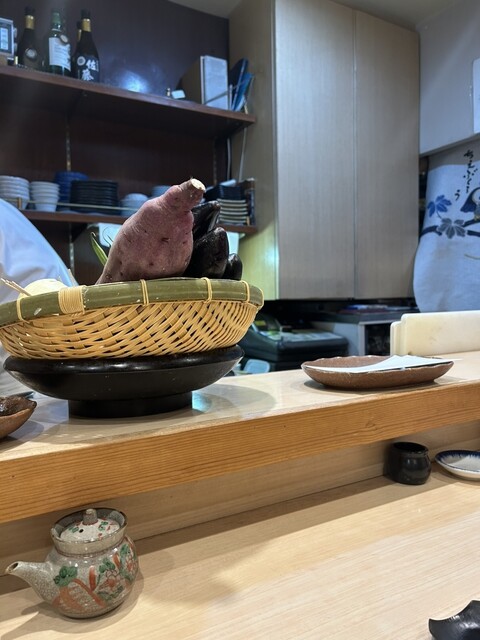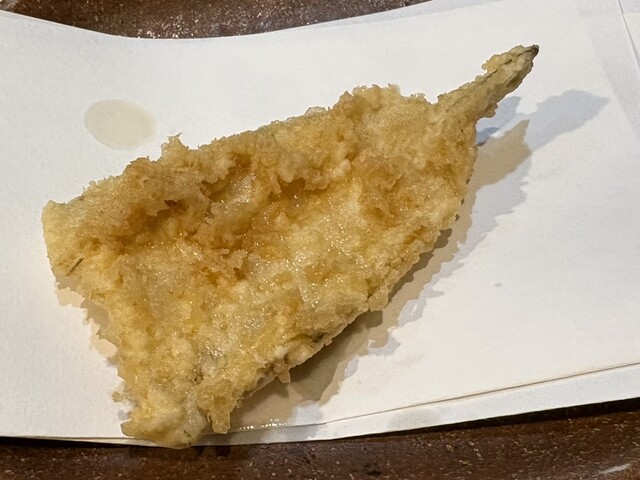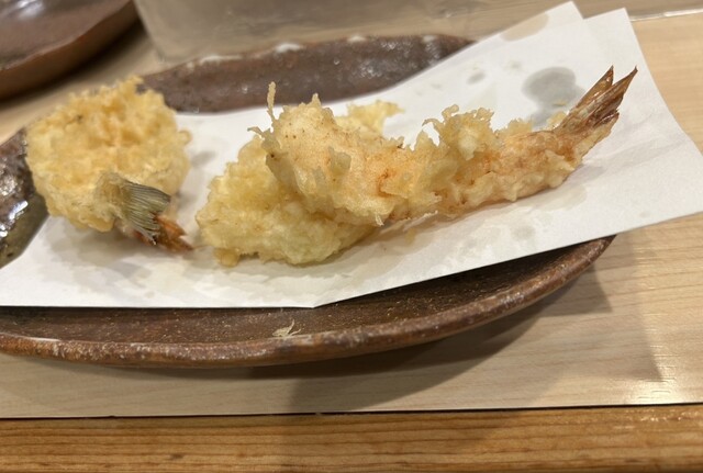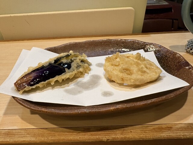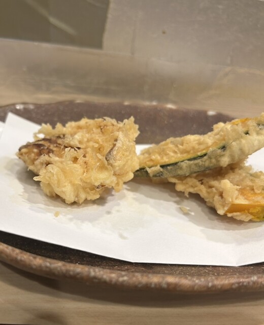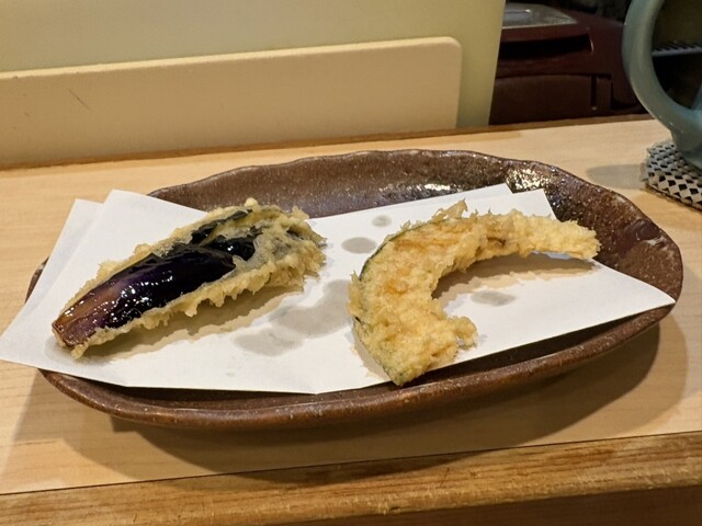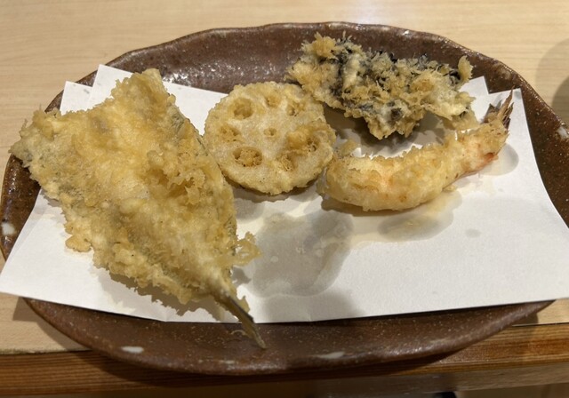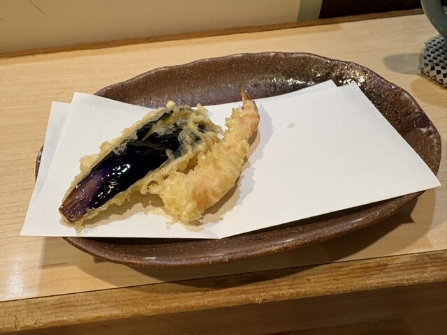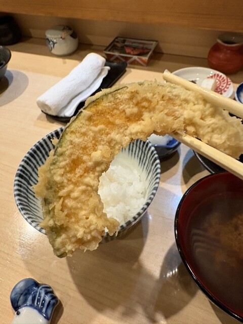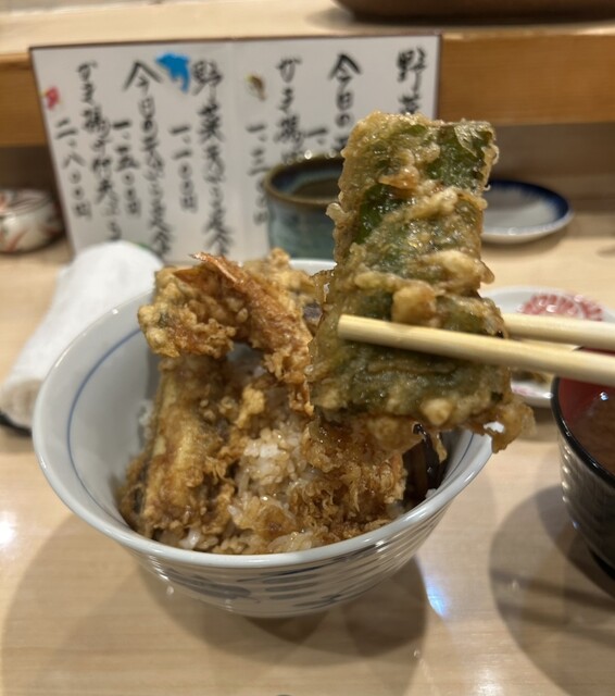 10時過ぎに予約を入れて、開店時刻の11時30分に一番乗り入店。感じの良い女将さんに迎えていただきました。天丼にしようか迷いましたがが、ほんのちょっと奮発して(笑)、『今日の天ぷら定食(税込1500円)』にしました。こちらのお店は、『天ぷら百名店2022』、『天ぷら百名店2023』の選出店です。私の後から、お一人様の男性が4人入店。先のお二人は、席の間を空けてカウンター席へ、後のお二人は、これまた席の間を空けてテーブル席へと女将さんが案内。まだ空いているとはいえ、カウンター席で隣り合わせの方とぎゅうぎゅうとならないようにとの気遣いが、なんとも自然でありがたいです。なんと皆さん、私以外は、『今日の天丼(税込1100円)』のオーダーです。『ムムムムム…。』。カウンター席からは、親方がご飯をよそったり、天ぷらを揚げる様子がしっかり見えて、天ぷらを揚げる油の音も雰囲気たっぷりです。天丼は一気に着丼ですが、私だけが揚げたて、熱々の天ぷらをカウンターのお皿にのせていただきました。ランチでこのスタイルは、とても贅沢ですね!手元には熱々ホッカホカの銀シャリとシジミの赤出汁の味噌汁!お新香も付いています。まずは、『えび』と『かぼちゃ』、『茄子』から。『えび』は小振りながらサクリとした歯触り、えびの甘みなんともいい感じ。美味し!『かぼちゃ』はほくほく、こちらも甘みが美味っ!美味っ!です。気っぷの良い親方から、『ご飯のおかわりどうですか?』の優しいお声掛けに、思わず(いや、待っていました!)、『おかわりお願いします』。天ぷら2巡目は、なんと二匹目のドジョウならぬ、『二匹目のえび!』。さらに、『れんこん』、『舞茸』、『鱚』が熱々揚げたてでカウンターのお皿の上に。『れんこん』は、ねっとり、シャッキリ食感!『舞茸』もこれまたサックサク!『鱚』もあっさりサックリ食感で、うメェ!うメェ!いやいや、このクォリティ、パフォーマンスで1500円は安すぎでしょ!とてもとても美味しかったです!親方と女将さんは、自然体ながらとても感じが良かったし、『ありがテェ!ありがテェ!ランチタイムでした。』ご馳走様でした。