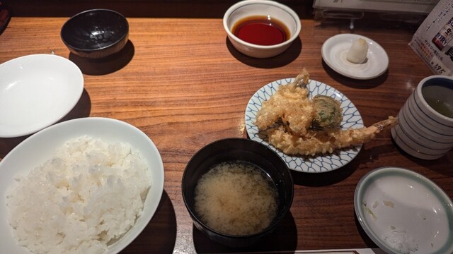 (海老の天ぷら×2、キスの天ぷら、イカの天ぷら、茄子の天ぷら、ピーマンの天ぷら、ご飯、しじみ汁、お新香)