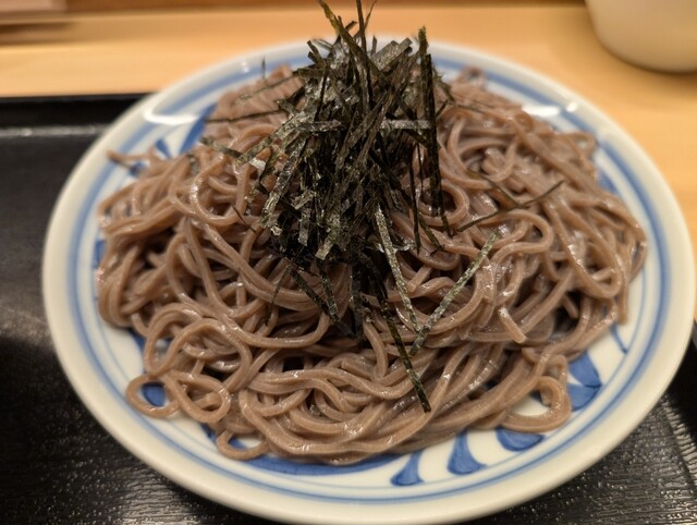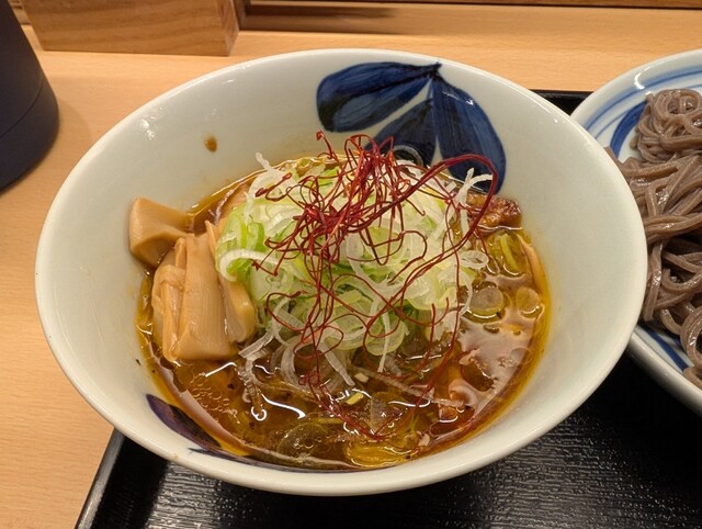 鶏つけ蕎麦が一番人気です。ぐるなびのクーポンを使用して、蕎麦を大盛りにしてもらいました。蕎麦はみずみずしくて、コシがあり、噛むほどに蕎麦粉の風味も味わえます。つけ汁は鶏白湯スープをベースにして、ラー油で辛味が付いています。お蕎麦を三分の一から半分ほどつけるだけで、お蕎麦とスープの美味しさをそれぞれ味わえます。つけ汁の中に、熱々の鶏天が3つも入っています。最後は鳥取県の大山鶏が肉厚でふっくらしています。最後、つけ汁を熱々の蕎麦湯で1対1で割って、滋味深い鶏白湯を楽しみました。